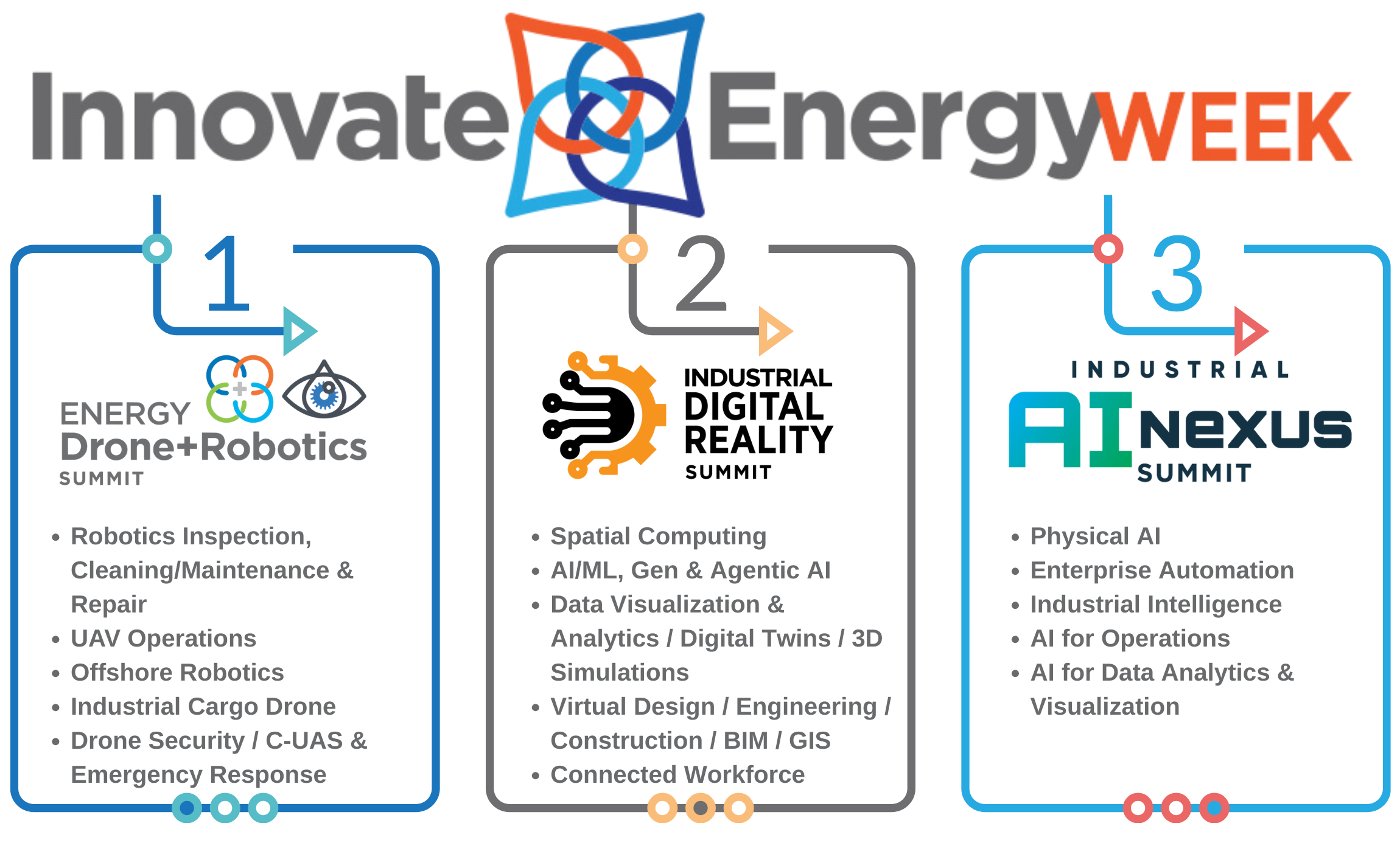 Join us at InnovateEnergy Week, where three industry-leading conferences, the Energy Drone & Robotics Summit, Industrial Digital Reality Summit and Industrial AI Nexus Summit converge into one unprecedented mega-event under a single roof.